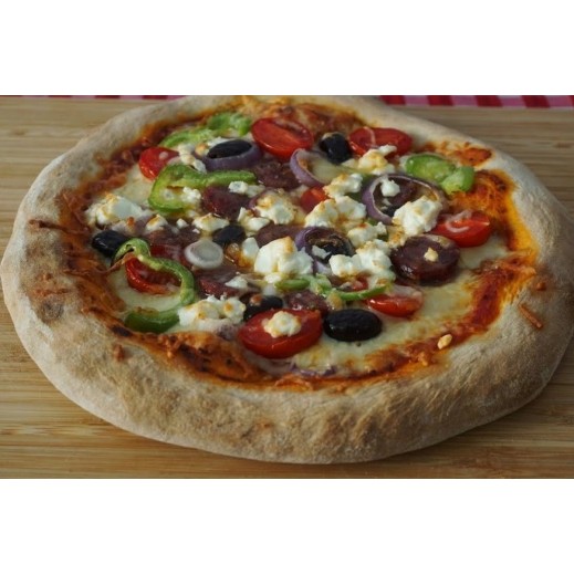 Μεσογειακή πίτσα με ντομάτα,ρόκα,κρεμμύδι,ελιά και κόκκινη πιπεριά