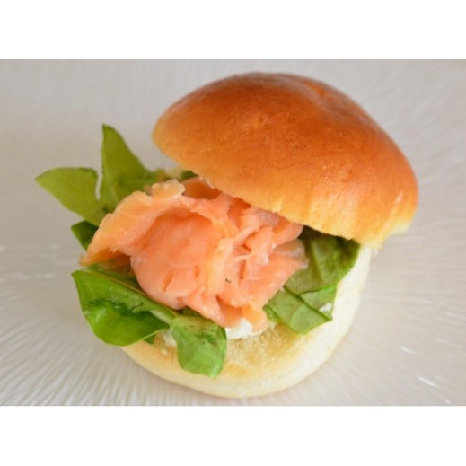Μπριος ψωμάκι μίνι με σολωμό,ρόκα και σάλτσα λεμονιού