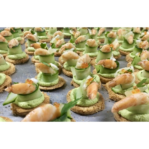 Φέτα αγγούρι με γαρίδα με κρέμα από αβοκάντο
